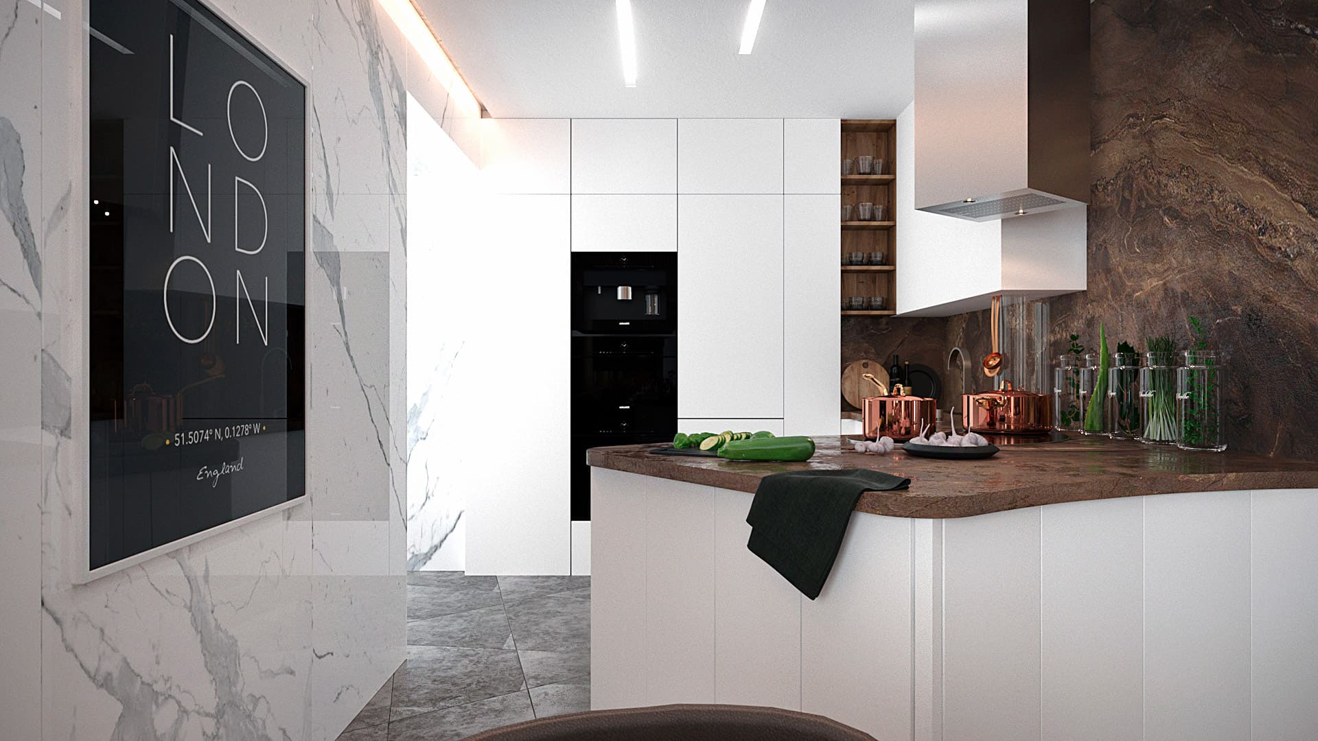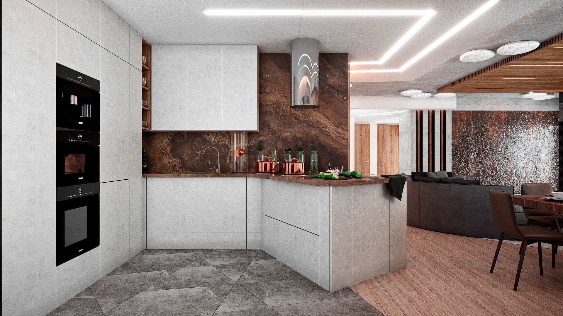 Такое решение позволило создать динамичную и необычную структуру пространства. Кухня, гостиная, обеденная зона и холл связаны между собой плавным развитием линий и материалов.
