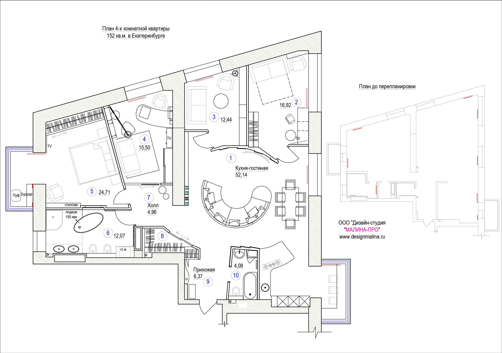 Дизайн интерьера квартиры 152 м² Токарей 68 Екатеринбург — Малина ПРО