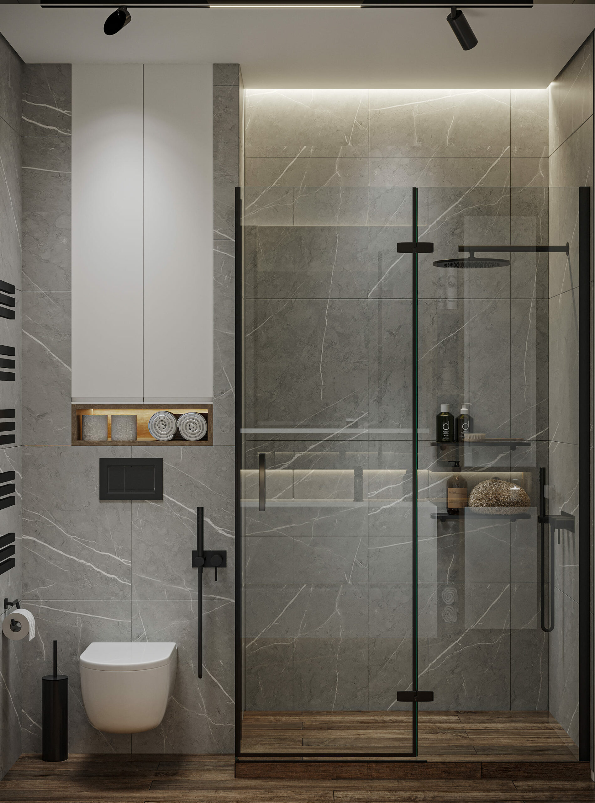 В отделке использованы крупноформатные материалы с фактурой камня и дерева, которые формируют спокойную и современную атмосферу. Подсветка ниш и зеркала подчёркивает архитектуру пространства и добавляет глубину интерьеру.