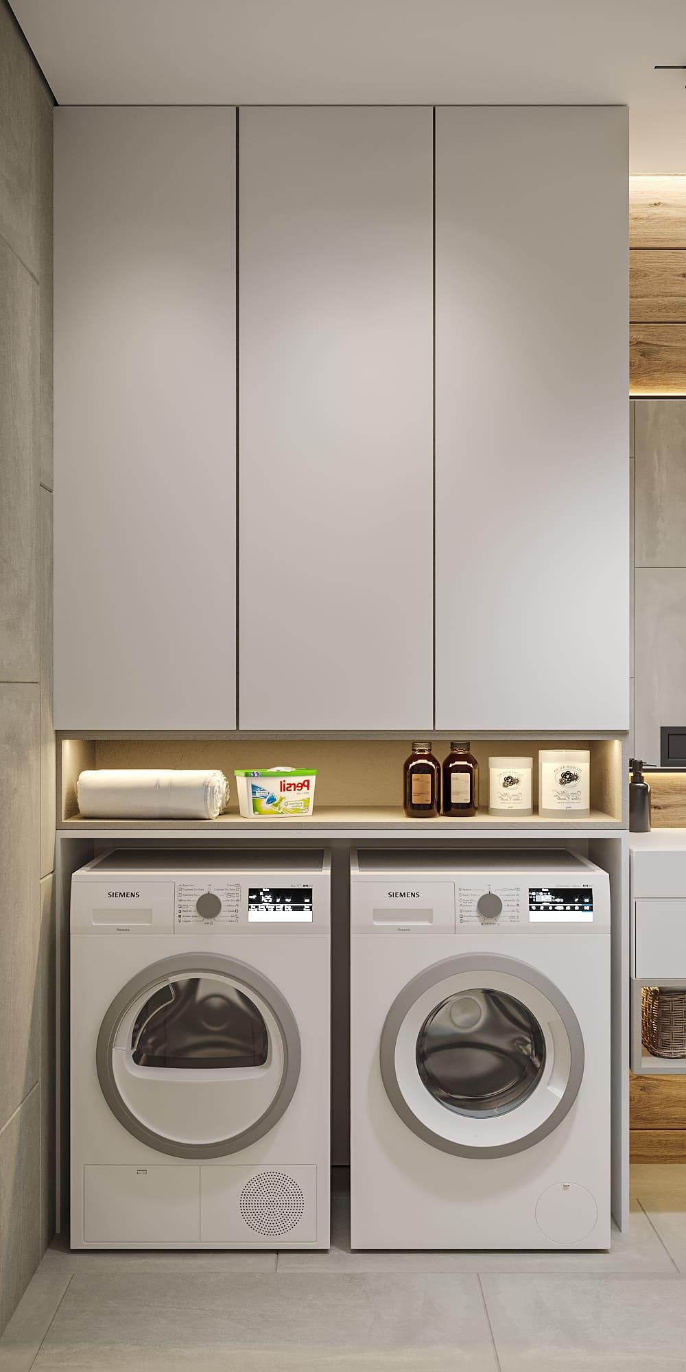 В интерьере использовано сочетание плитки под бетон и дерево, что создаёт тёплый и современный образ. Встроенные шкафы и ниши позволяют сохранить чистоту линий и избежать визуального шума.