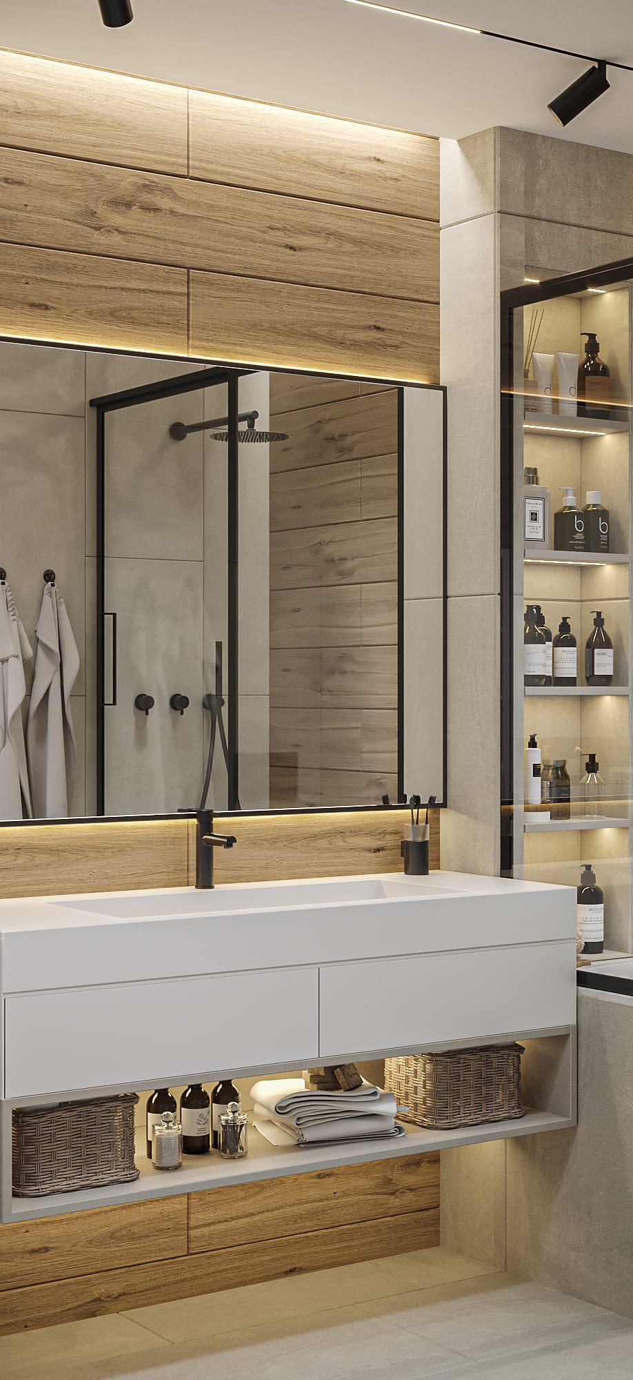 Особое внимание уделено деталям: в зоне ванны предусмотрен встроенный стеллаж с подсветкой для хранения и декора. Освещение решено через точечные светильники и линейную подсветку, что подчёркивает архитектуру пространства.